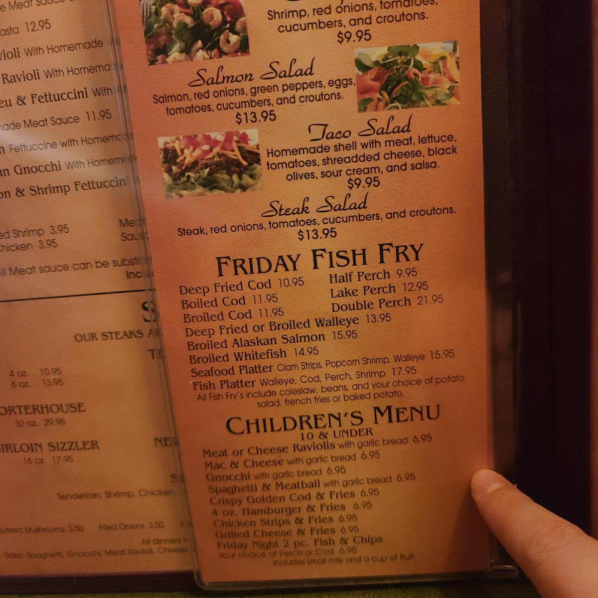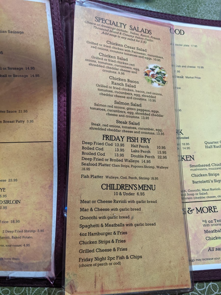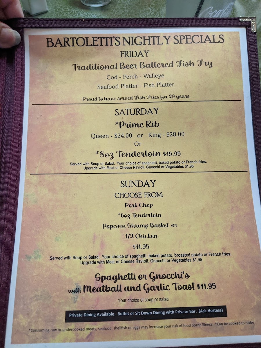 Welcome to Bartolettis Restaurant, a gem nestled in Niagara, WI, where traditional flavors meet a warm, inviting atmosphere. This family-friendly establishment shines every Friday with its Traditional Beer Battered Fish Fry, offering an array of expertly prepared fish dishes such as the deep-fried or broiled walleye, and a delicious seafood platter. Patrons rave about the generous portions and delightful taste.