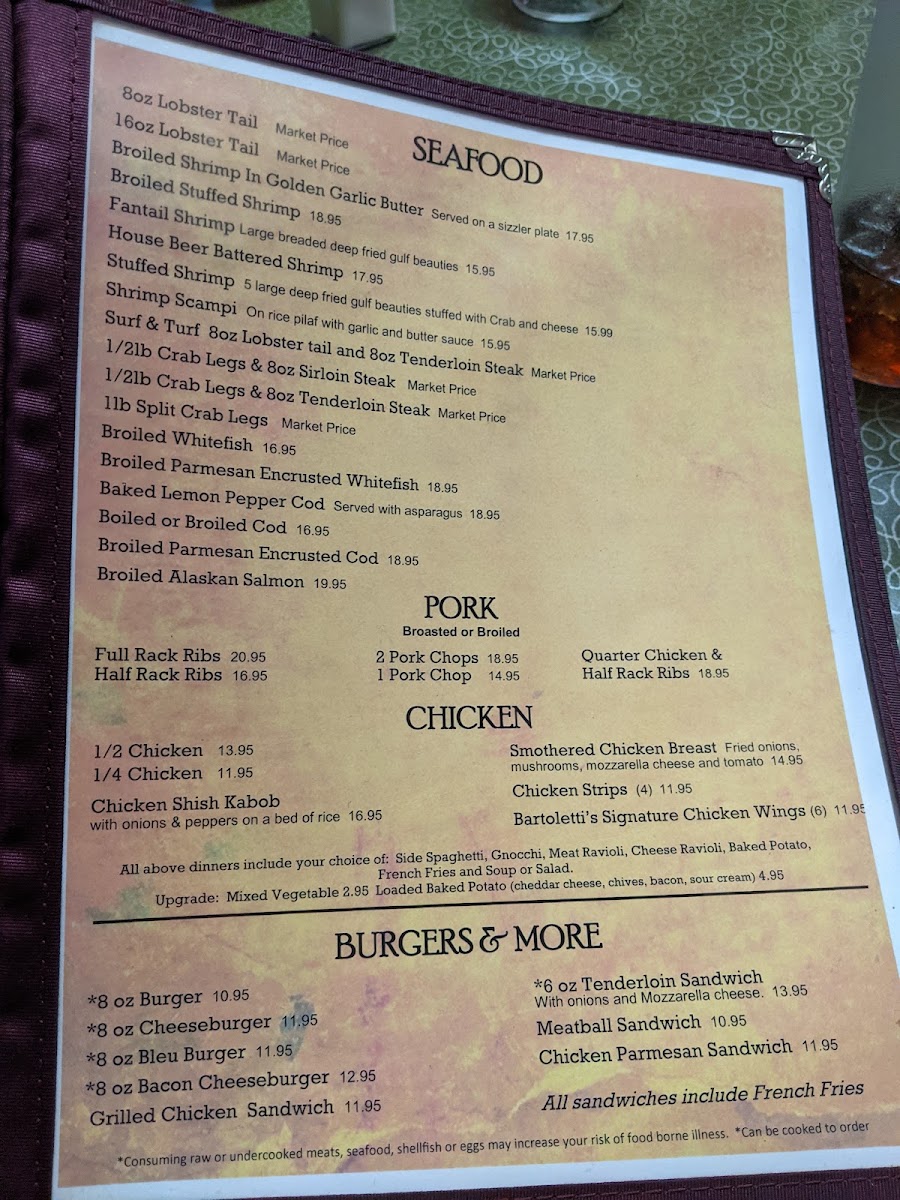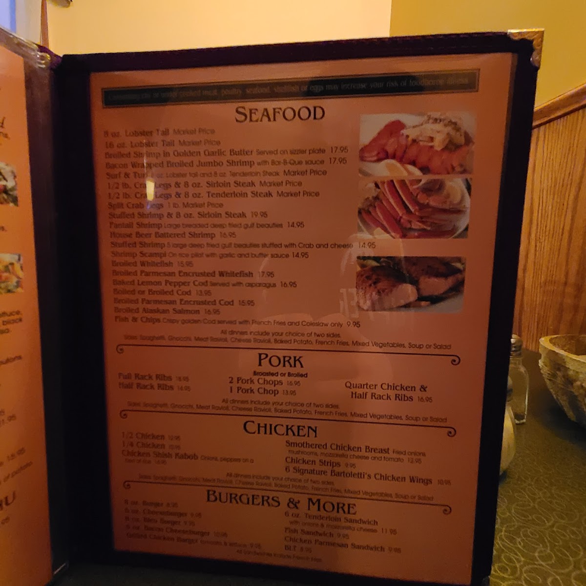 Highlighted dishes include the Combination Platter with flavorful Italian samples and succulent steaks, perfect for any palate. Bartolettis is not just a restaurant; it’s a celebration of culinary tradition that keeps customers coming back for more.